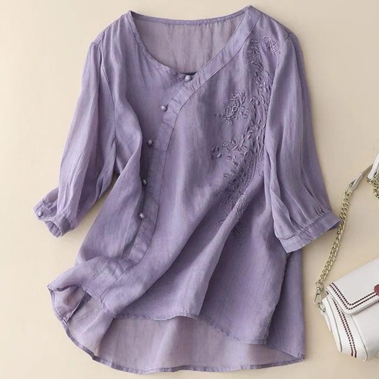 Women's Cotton Linen V Neck Retro Embroidered comfort Casual Top